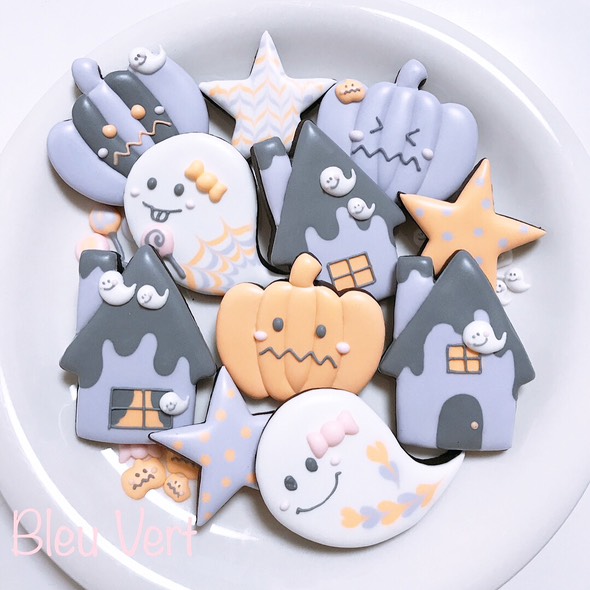 おばけ、かぼちゃ、ハウス、星の 4枚のクッキーを作ります。