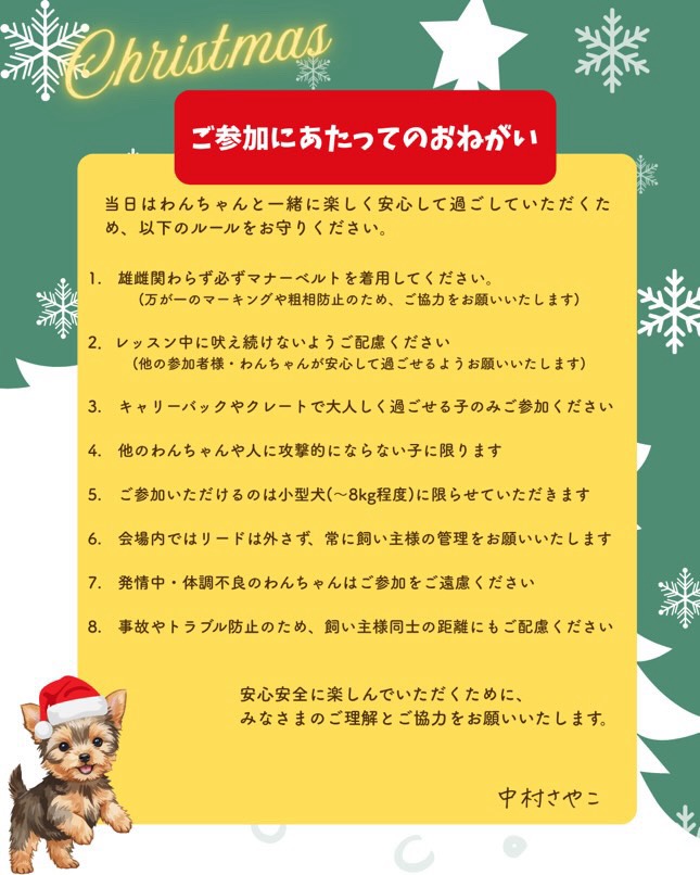 | 備考 | ⭐️わんちゃん同伴可 ⭐️わんちゃんは無料 わんちゃん同伴で参加してくださる方へのお願いをお写真8ページに記載してあります ご一読ください🙇 当日わんちゃんと一緒に楽しく安心して過ごしていただくためご理解、ご協力よろしくお願いします🙇 |