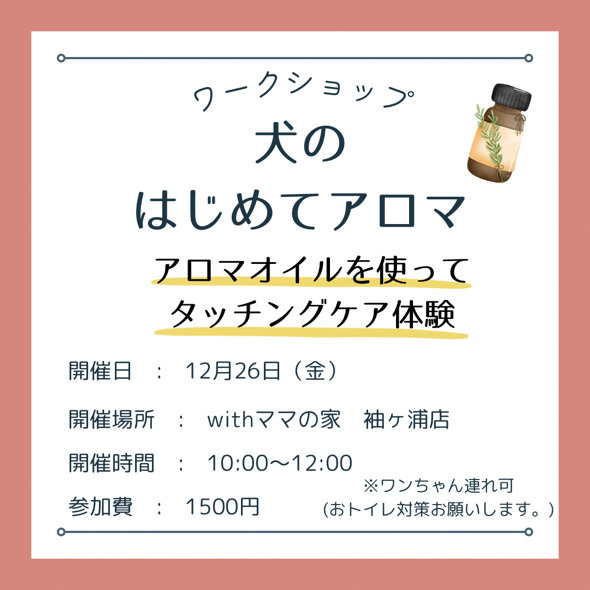 ワンちゃんへアロマオイルを使って お家でも出来るタッチングケアの体験をします。 ワンちゃんがお好きなアロマオイルを選んで頂き、 マッサージをレクチャー!! 飼い主さんとのコミュニケーションにもなり、 絆がとても深まります […]