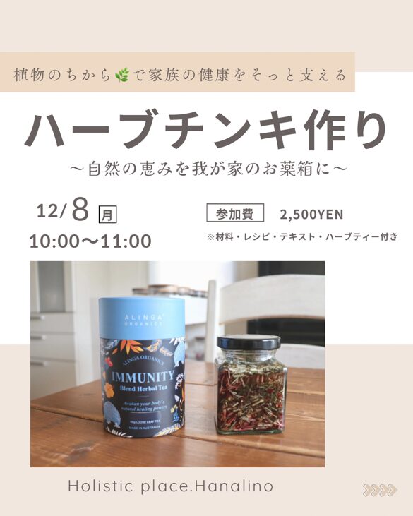 ハーブチンキを知っていますか? 自然の恵みをぎゅっと濃縮した、 からだ想いの“ハーブのしずく”。 今回は、免疫をやさしくサポートしてくれる ハーブを使って、チンキ作りの会をひらきます🌼 子育てや家事に追われる中でも、自然 […]