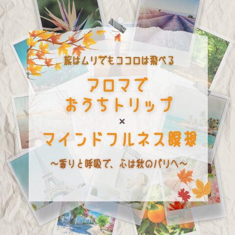 忙しい毎日の中で、心と体をゆっくり休める時間を 持てていますか? このセッションではアロマとマインドフルネス瞑想を 組み合わせて「心の中の小さな旅」へとご案内します。 今回のテーマは「秋のパリ」。 澄んだ空気を思わせるジ […]
